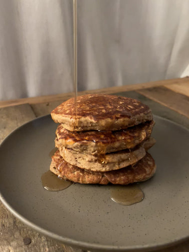 Whisk dry pancake mix thoroughly until completely blended. Add 2 cups of water, 1/4 cup of unsweetened organic apple sauce (accounted for in macros) and mix together until thoroughly blended. Use the 1/4 measuring cup to scoop 10 heaping spoonfuls of wet batter, making 10 thicc and hearty pancakes.