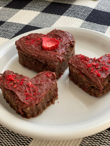 The special Valentine’s Day brownie consists of our popular “Down Brownie recipe” with organic strawberries added for a more “chocolate strawberry feel”.